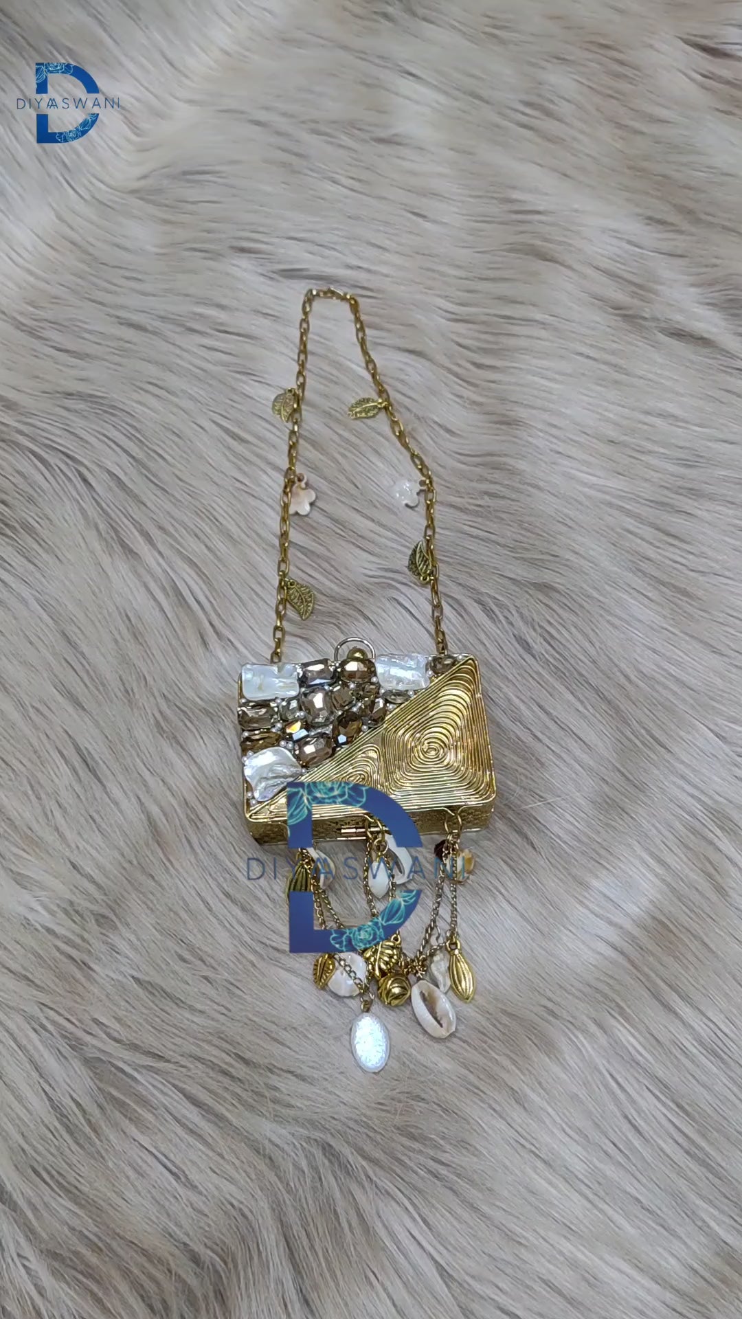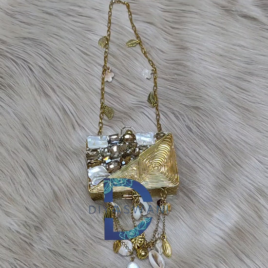 An artistic antique-finish metal clutch adorned with raw stones, pearl accents, and sculpted swirl detailing. Finished with cascading shell charms, it’s a bold statement piece for festive and fusion looks.