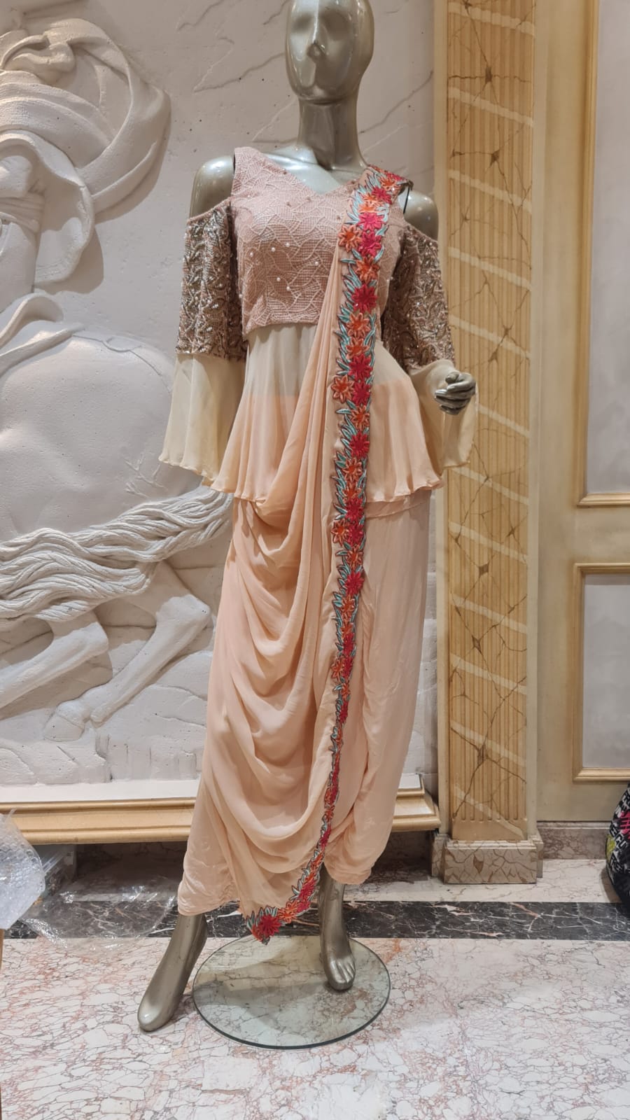 A stylish peach dhoti set featuring intricate embroidery and a ruffled top, perfect for special occasions.