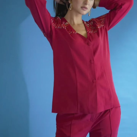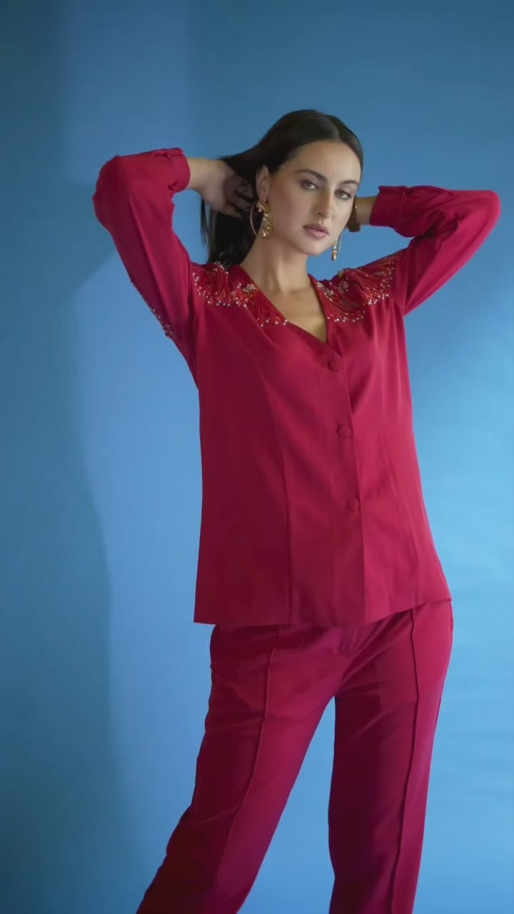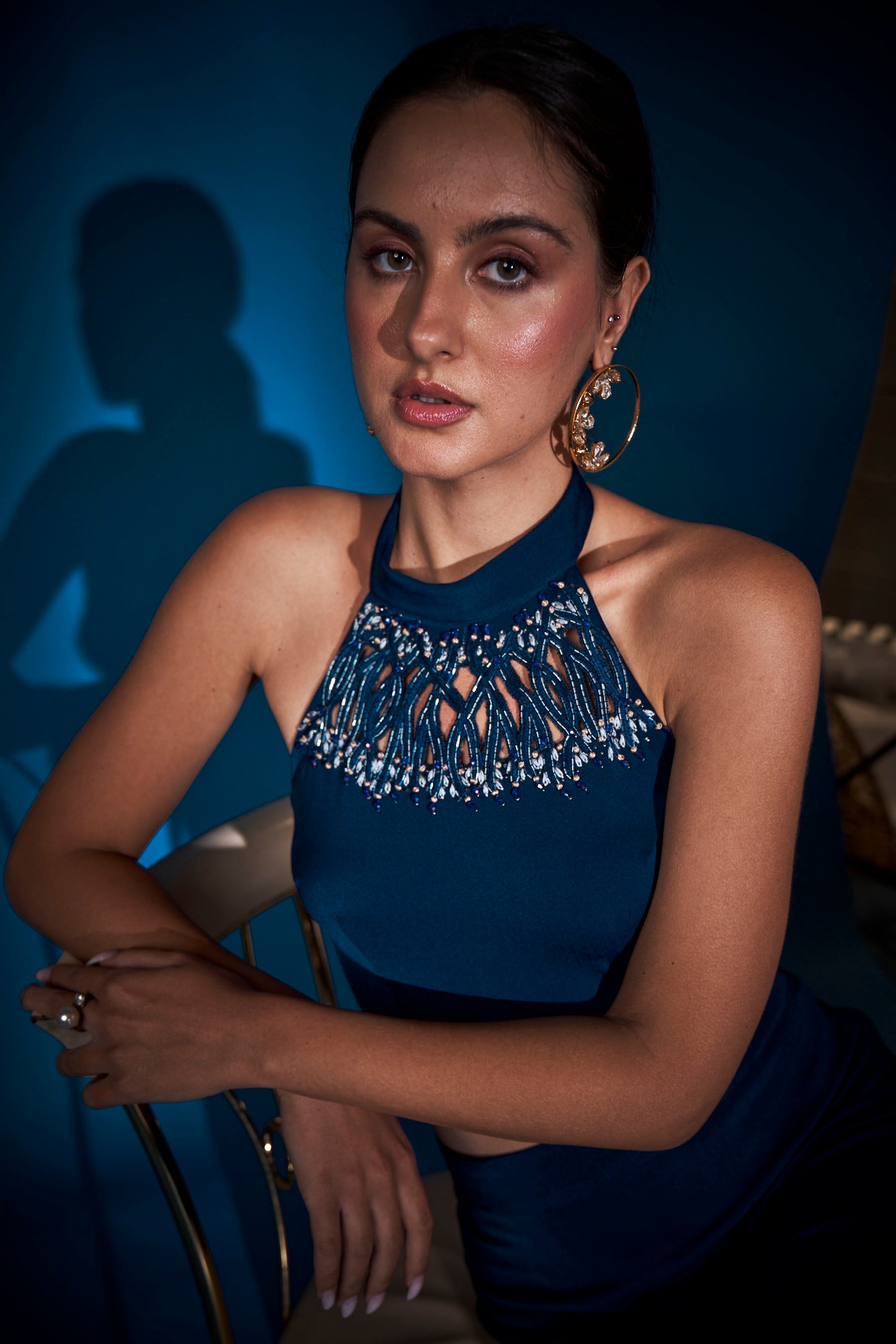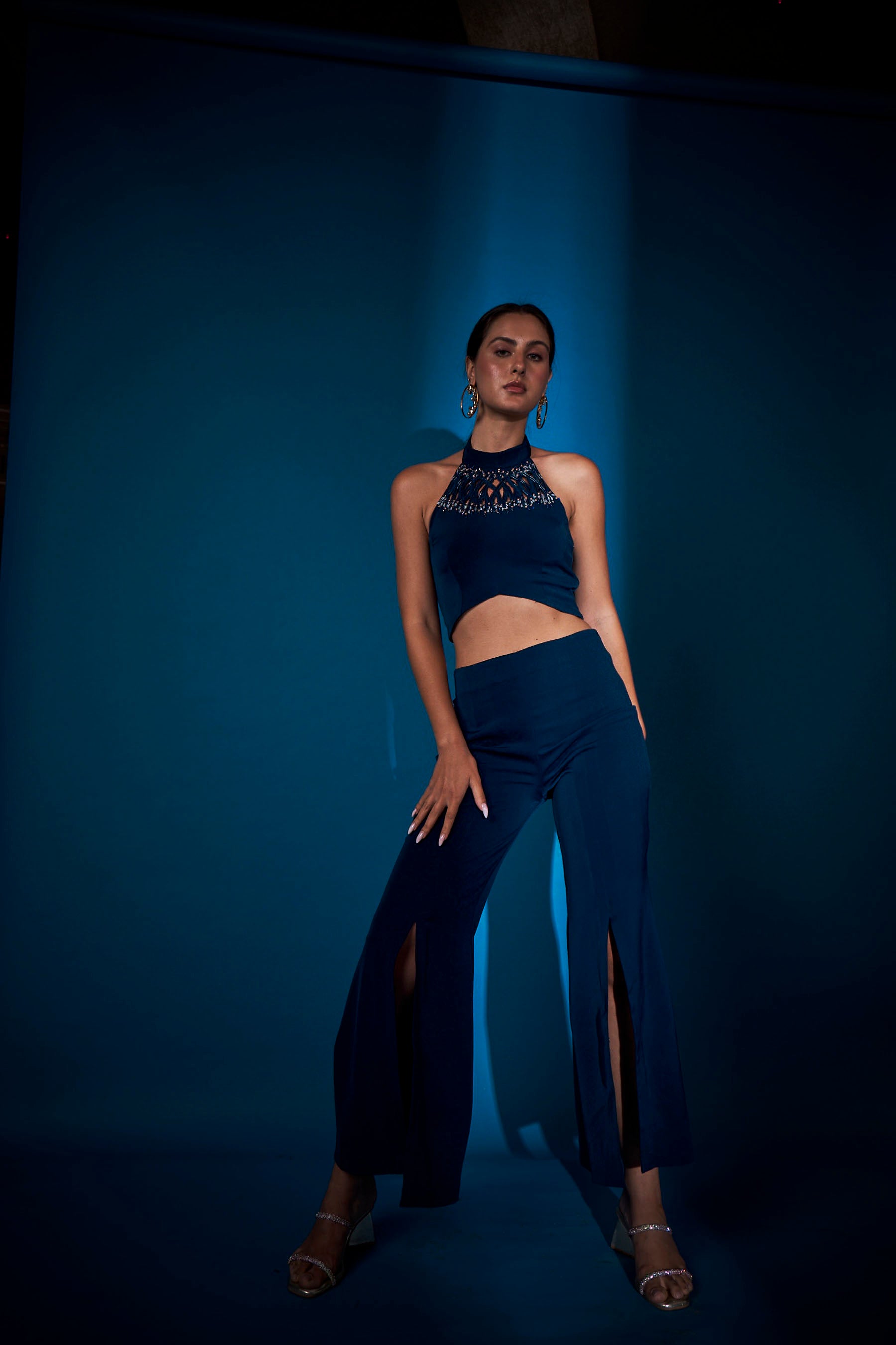 Elevate your style with this stunning teal halter neck cutwork crop top paired effortlessly with chic slit flared pants. The intricate cutwork detailing adds a touch of sophistication to the modern halter neck design, while the vibrant teal hue makes a bold fashion statement.