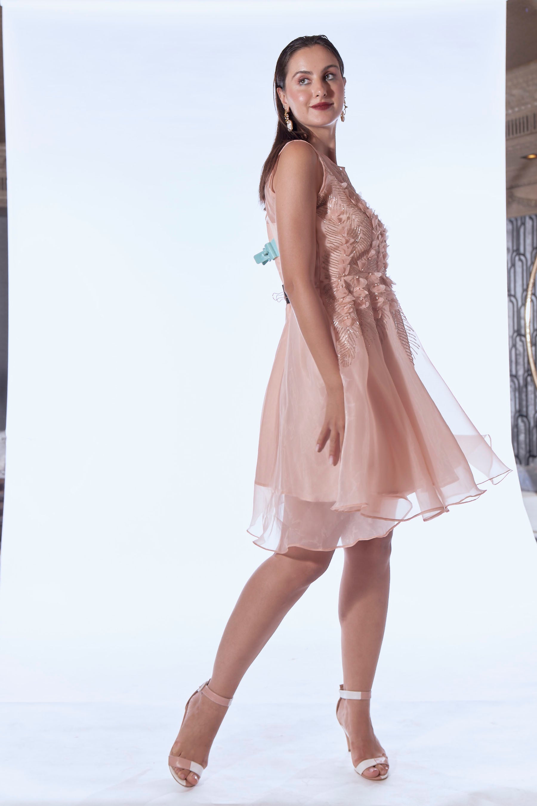 This beautiful peach-colored dress is made in a lightweight, sheer fabric. The dress is adorned with hand embroidery that features handcut tissue set as 3d flowers, embellished with moti and cut dana. These embellishments are arranged in a vertical wavyline, creating a stunning visual effect. The flowy nature of fabric adds to overall elegance and femininity of the dress, making it a perfect choice for a special or formal event.