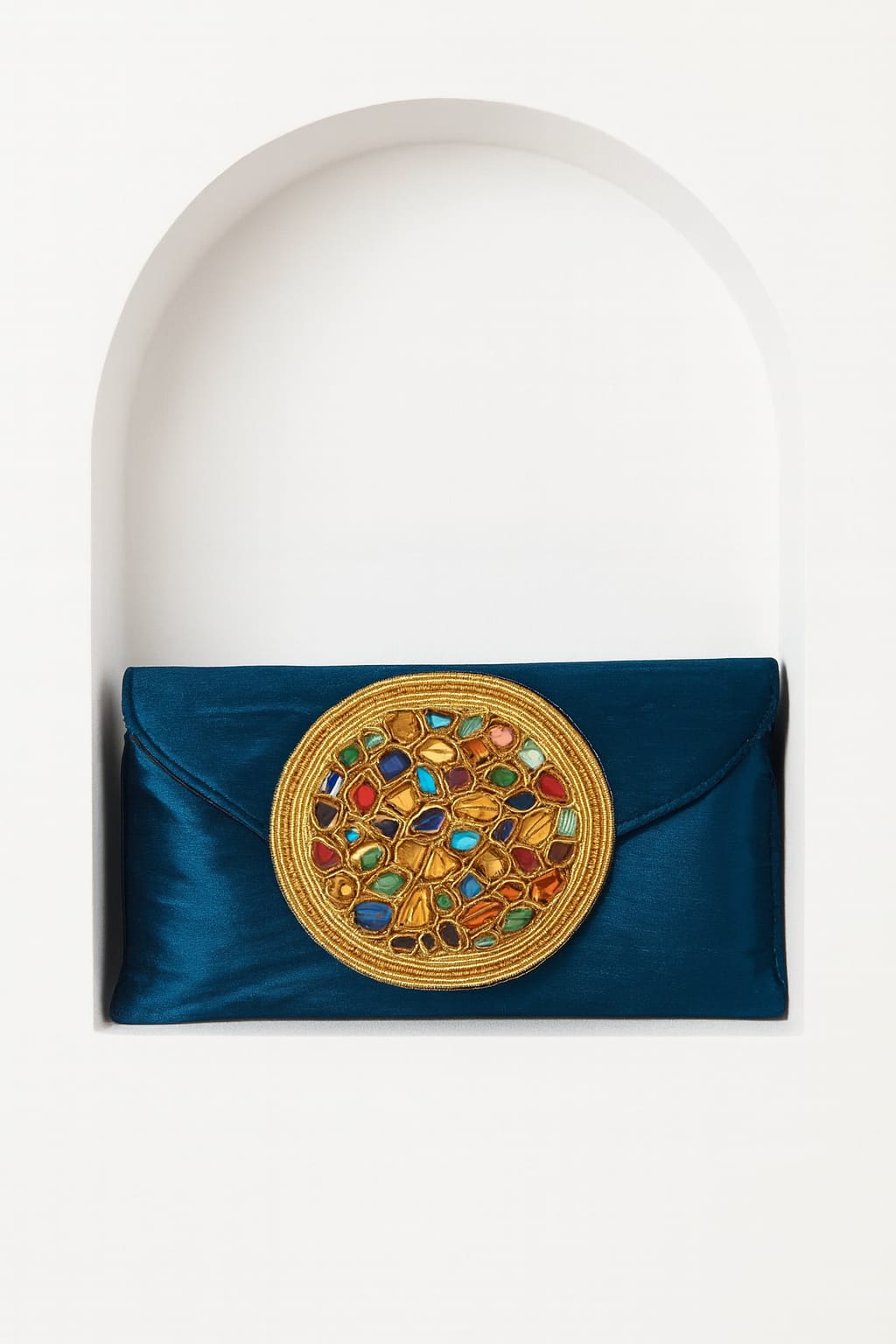 An elegant blue clutch adorned with a colorful mosaic medallion and golden detailing — a perfect blend of sophistication and festive charm.