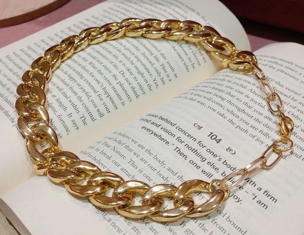 This modern chain features bold, rectangular links finished with a sleek toggle clasp. The chunky design and polished gold tone make it a statement piece that elevates any look.