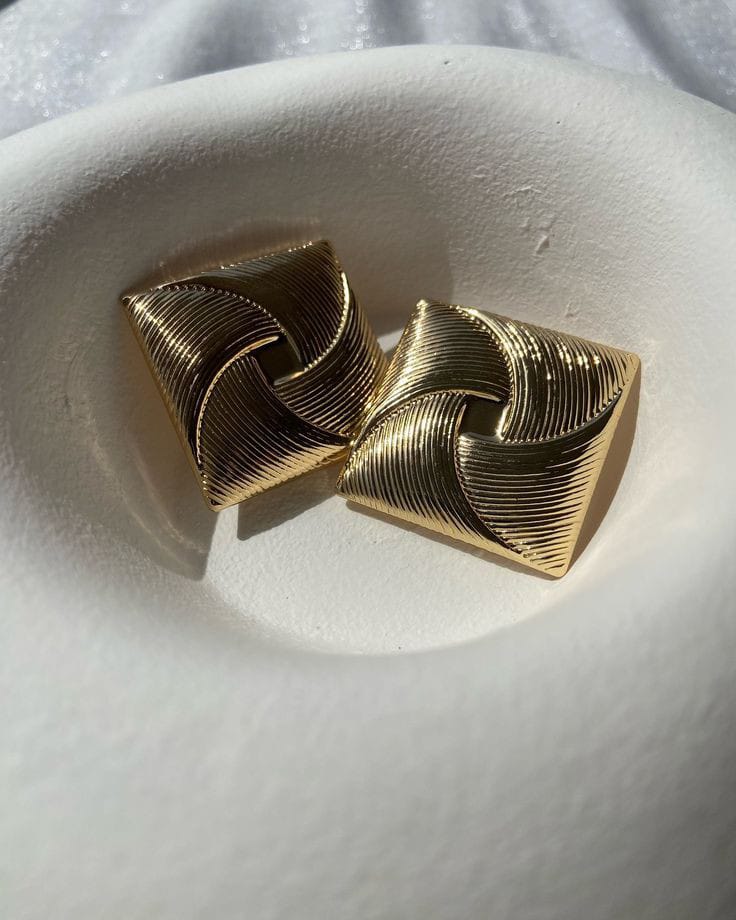 A pair of gold-colored square earrings with a textured swirl design. The earrings made of brass.