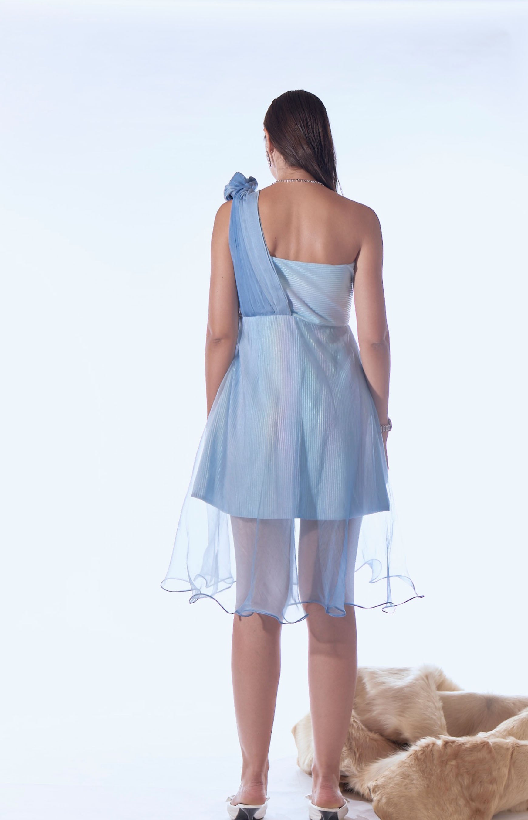 The aqua blue color and flowy silhouette gives a sense of lightness and freedom; while the gathered fabric enhanced with hand embroidered butterfly adds a touch of delicacy and elegance.