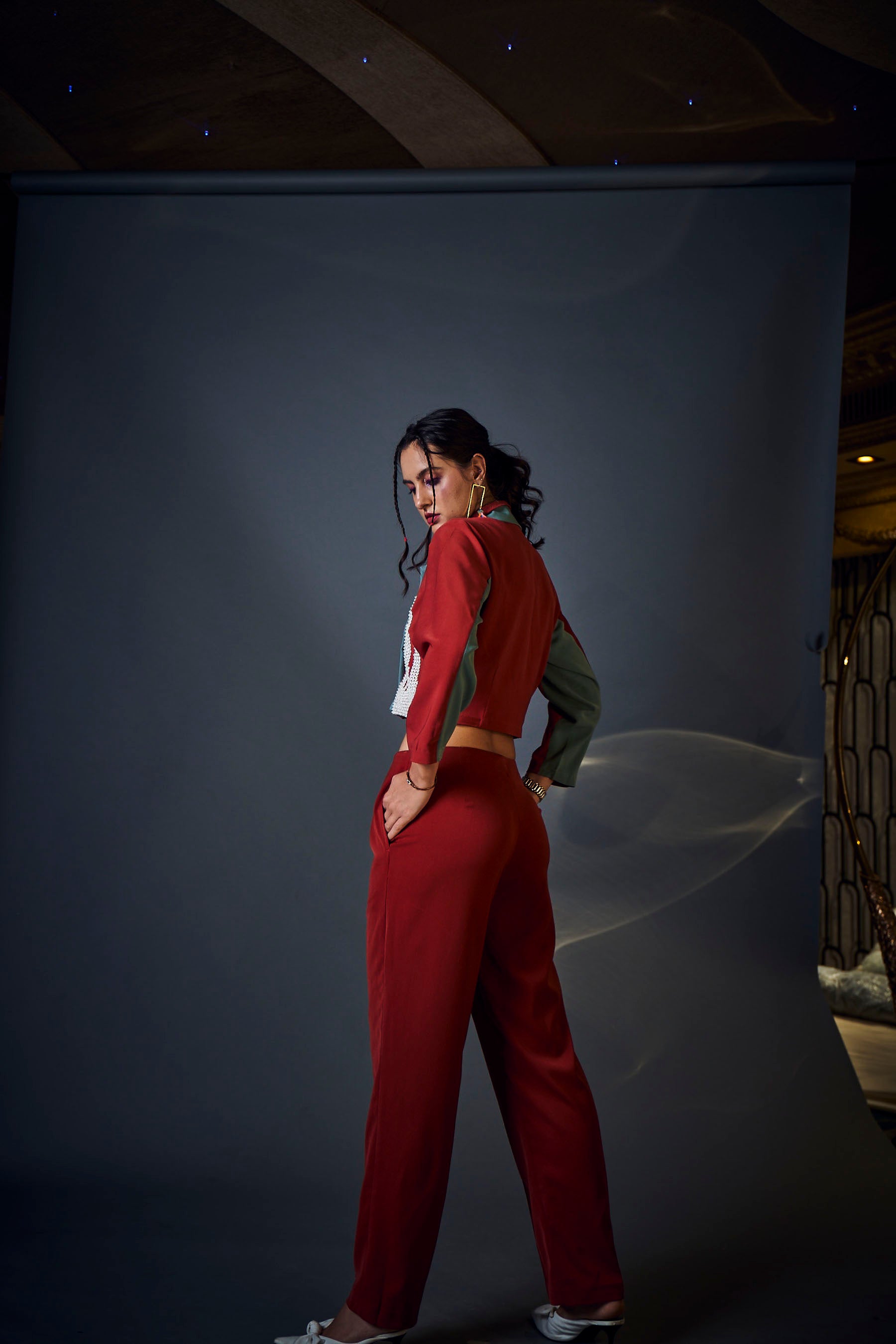 Two color dual collar lapels crop blazer with dual tone long sleeves teamed up with high waisted pin tucked straight fit pants is perfect for a coffee date.