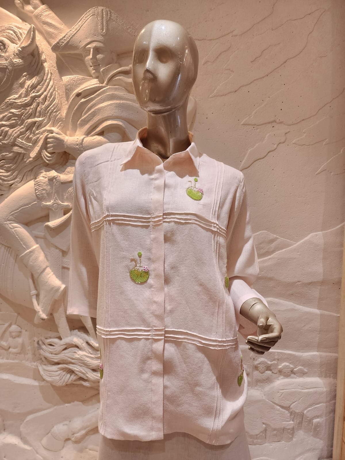 This is a soft blush pink top featuring delicate green perfume bottle embroidery and subtle pleated detailing across the front. Its minimalist design with a touch of whimsy makes it perfect for an understated yet stylish look.