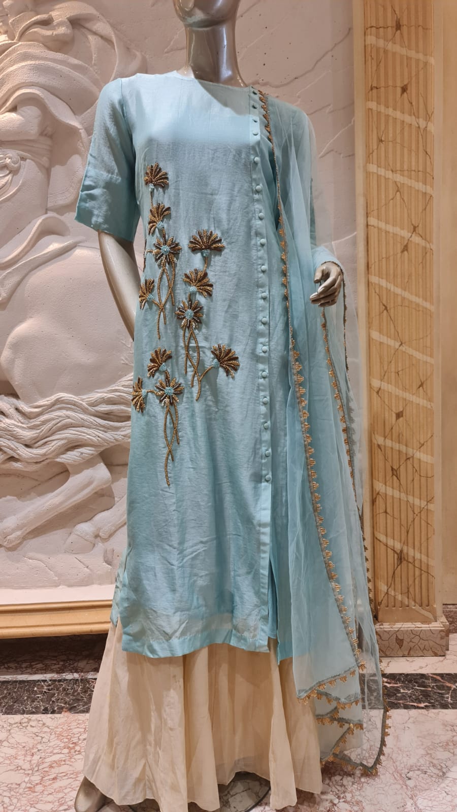 This stylish kurta set features a pastel blue kurta with delicate floral lace embroidery and a matching palazzo pant. The sheer dupatta with gold embellishments adds a touch of elegance.