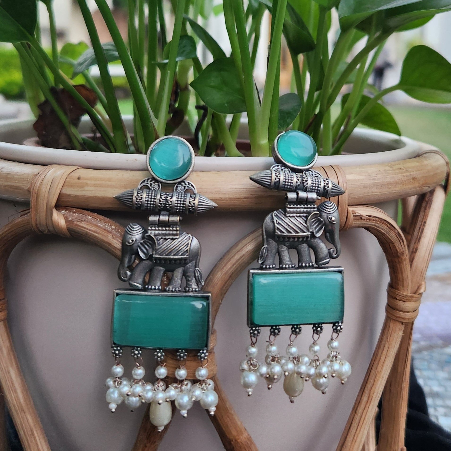 The earrings showcase a captivating blend of traditional and contemporary elements. The silver elephant pendants, accented by green gemstones and pearls, offer a unique design that adds a touch of ethnic elegance to any outfit.