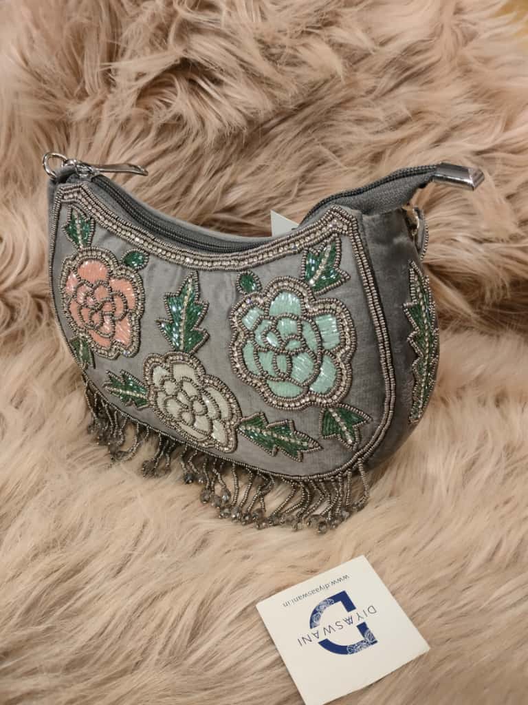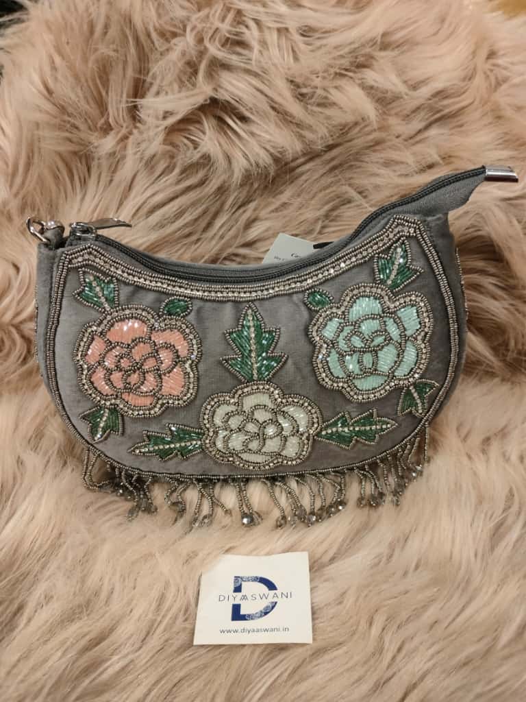 A beautifully hand-beaded clutch featuring delicate floral motifs and crystal tassels. Perfect to add timeless charm to your festive and evening looks.