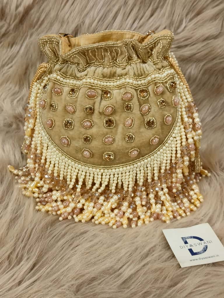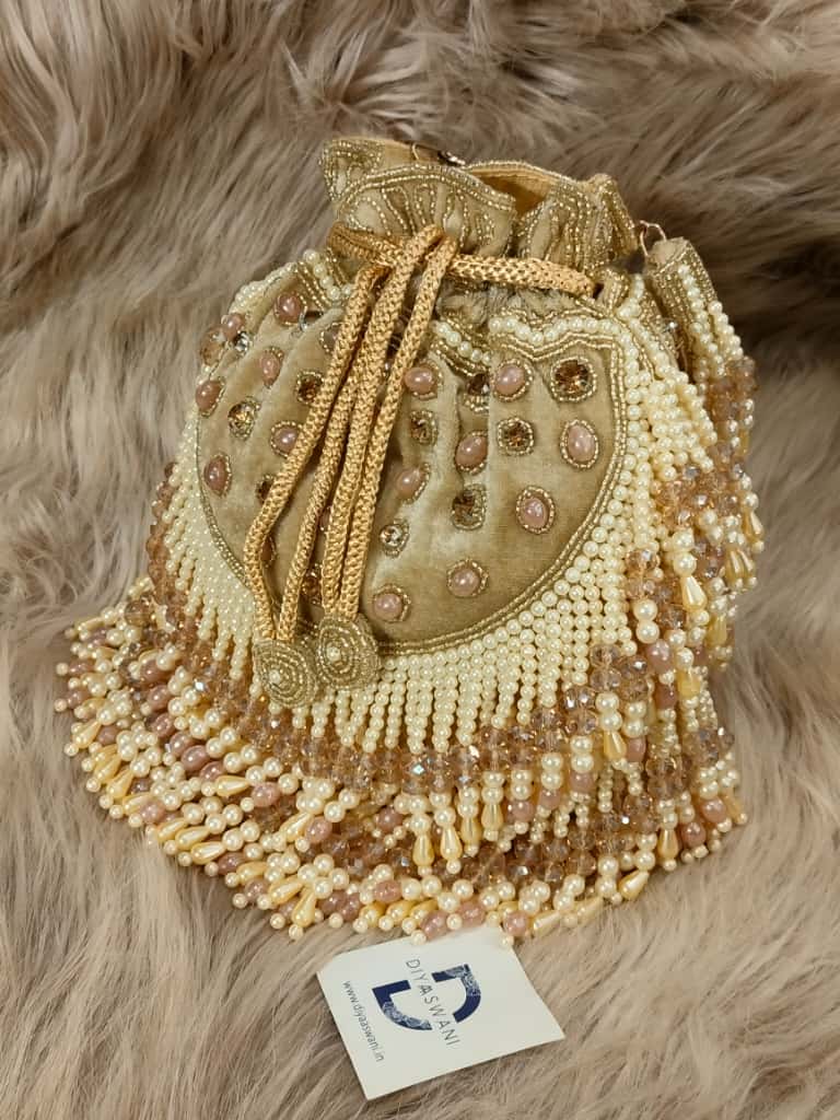 A stunning handcrafted potli adorned with pearls, crystals, and antique gold detailing for a truly regal look. Perfect for weddings and festive soirées where you want elegance to speak for itself.