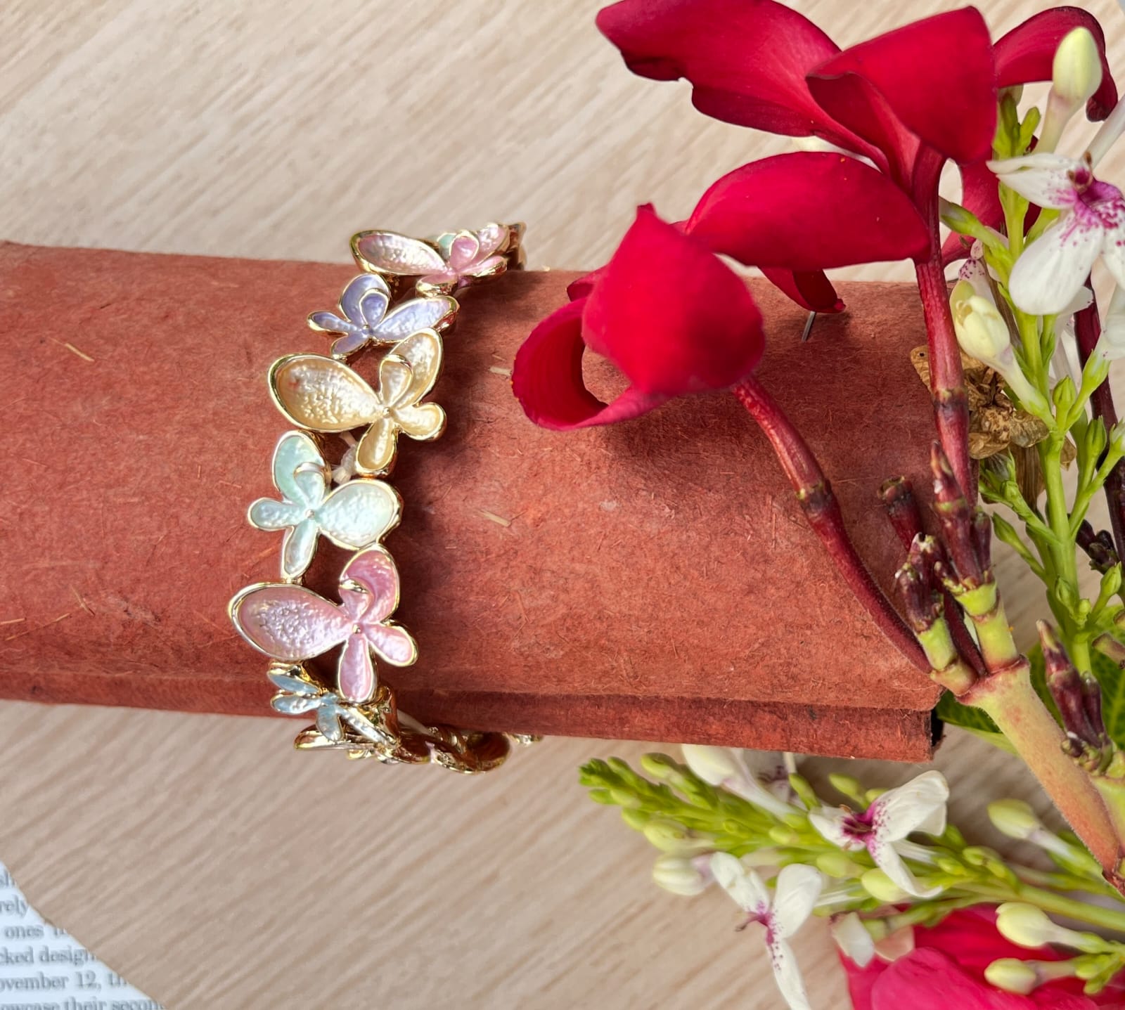 This set features three gold-toned bangles with a colorful floral petal design. The unique and artistic design adds a touch of playful elegance to any outfit.