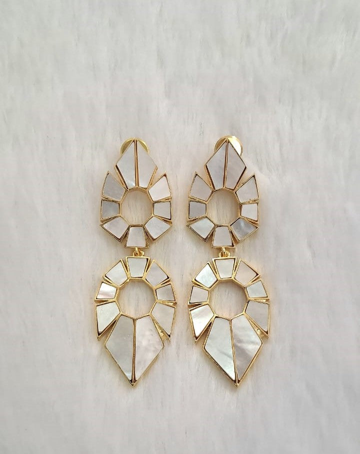 The earrings feature a geometric design with white mother-of-pearl accents and a gold-toned metal frame. The intricate pattern creates a unique and eye-catching piece.