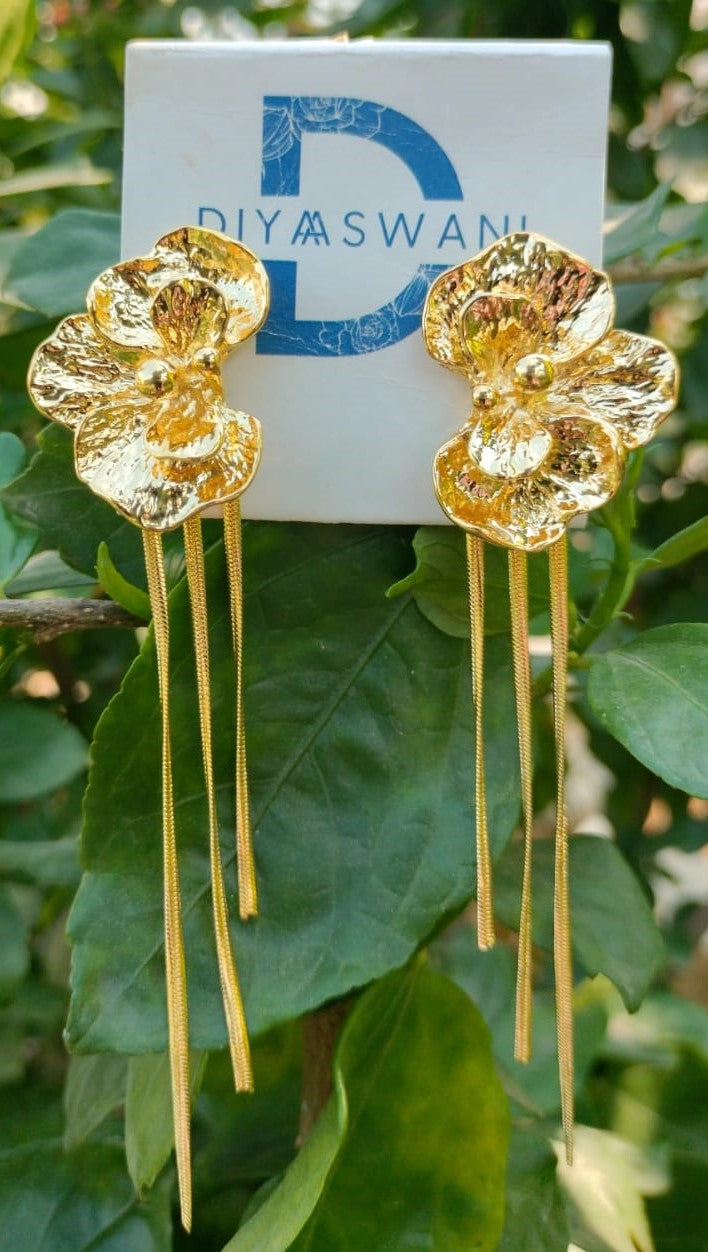 These golden earrings feature a delicate floral design with a cascading chain tassel. Perfect for adding a touch of elegance to any outfit.