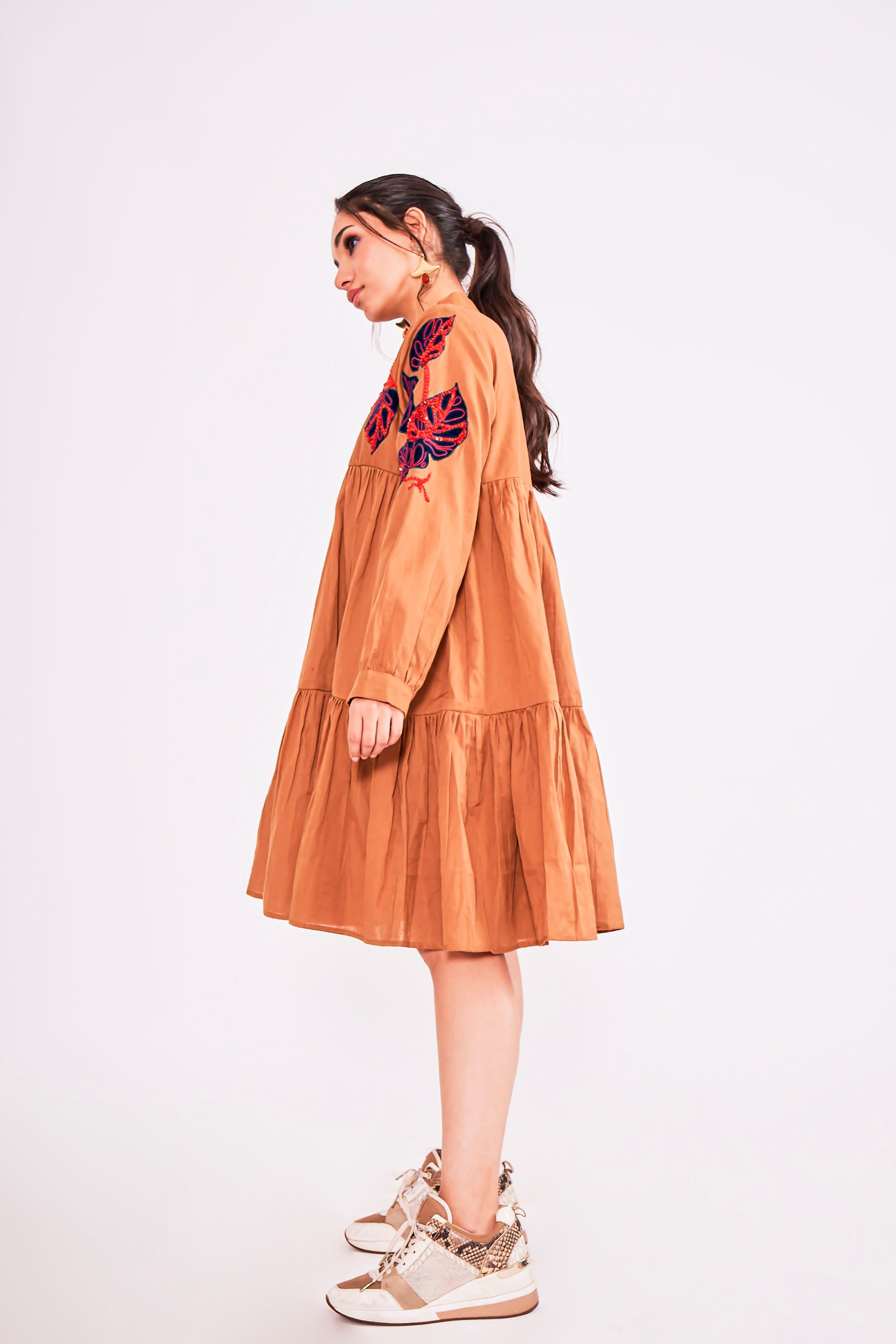 Elevate your style with our exquisite tiered dress, meticulously adorned with intricate appliqué and delicate handwork. This captivating ensemble combines the grace of tiered layers with the artistry of detailed embellishments,