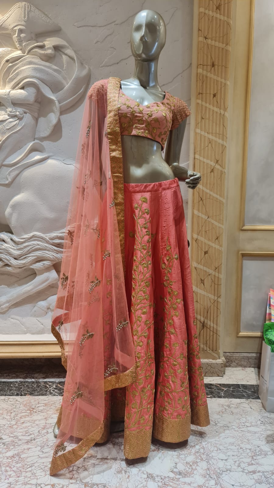 A beautiful peach lehenga featuring intricate floral lace Work and a matching dupatta, perfect for weddings and other special occasions.
