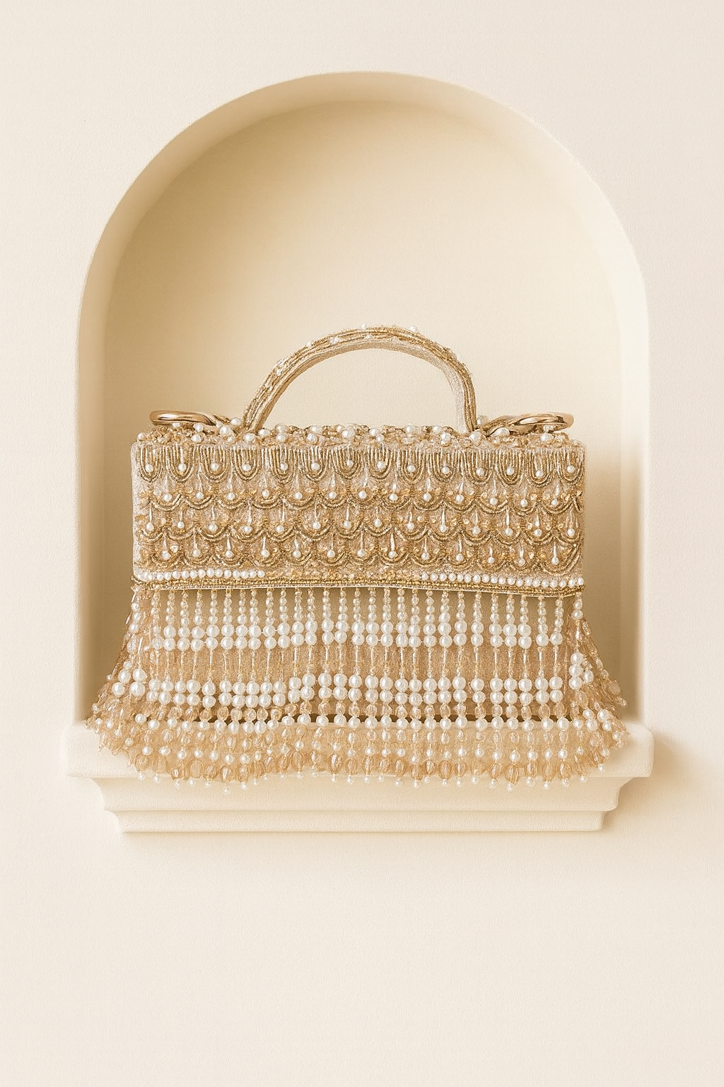 An exquisite pearl-encrusted handbag crafted to add statement luxury to your festive and wedding ensembles.