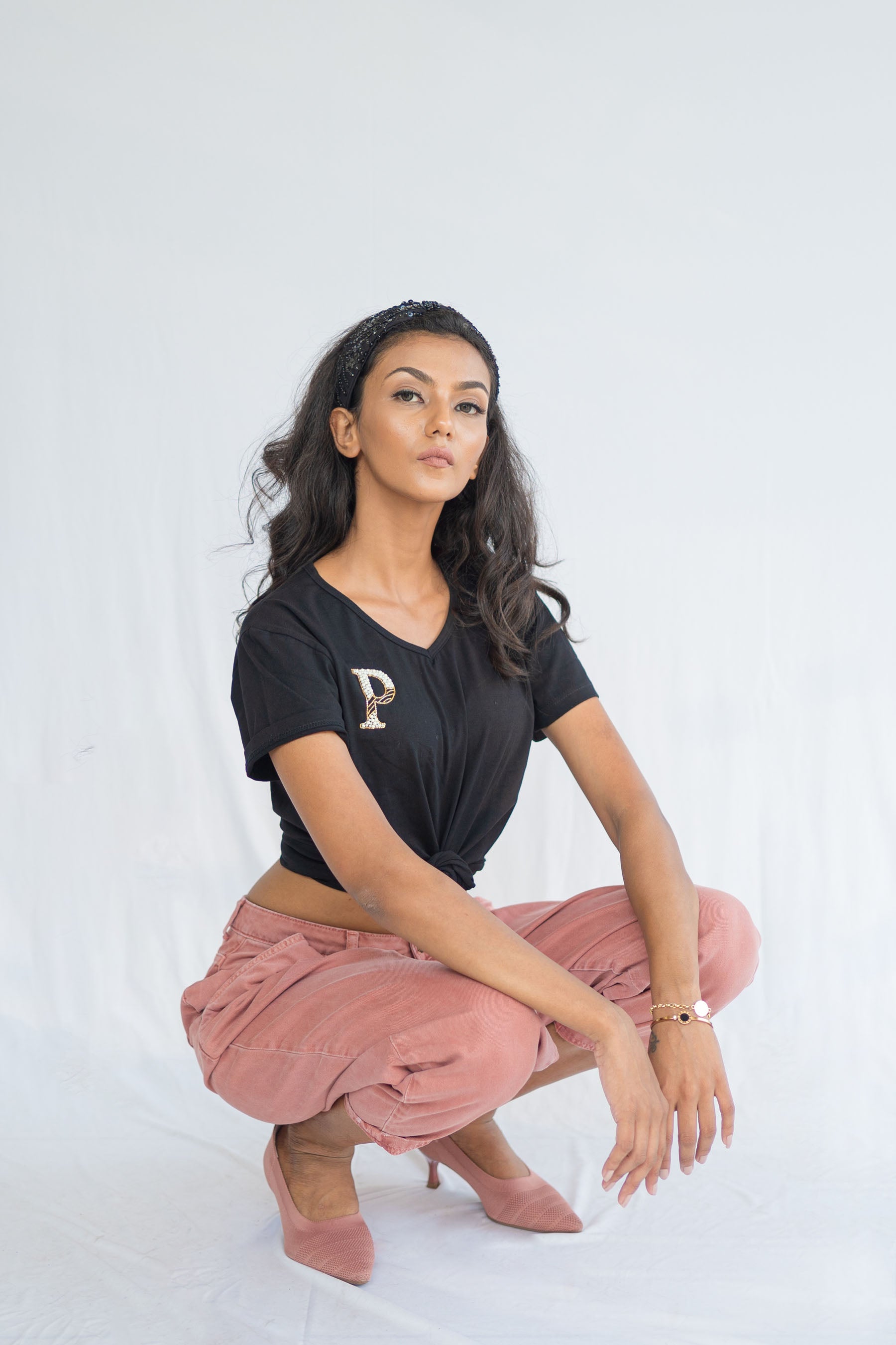 Black V-Neck T-shirt with P Initial Pearl Deatiled Embroidery
