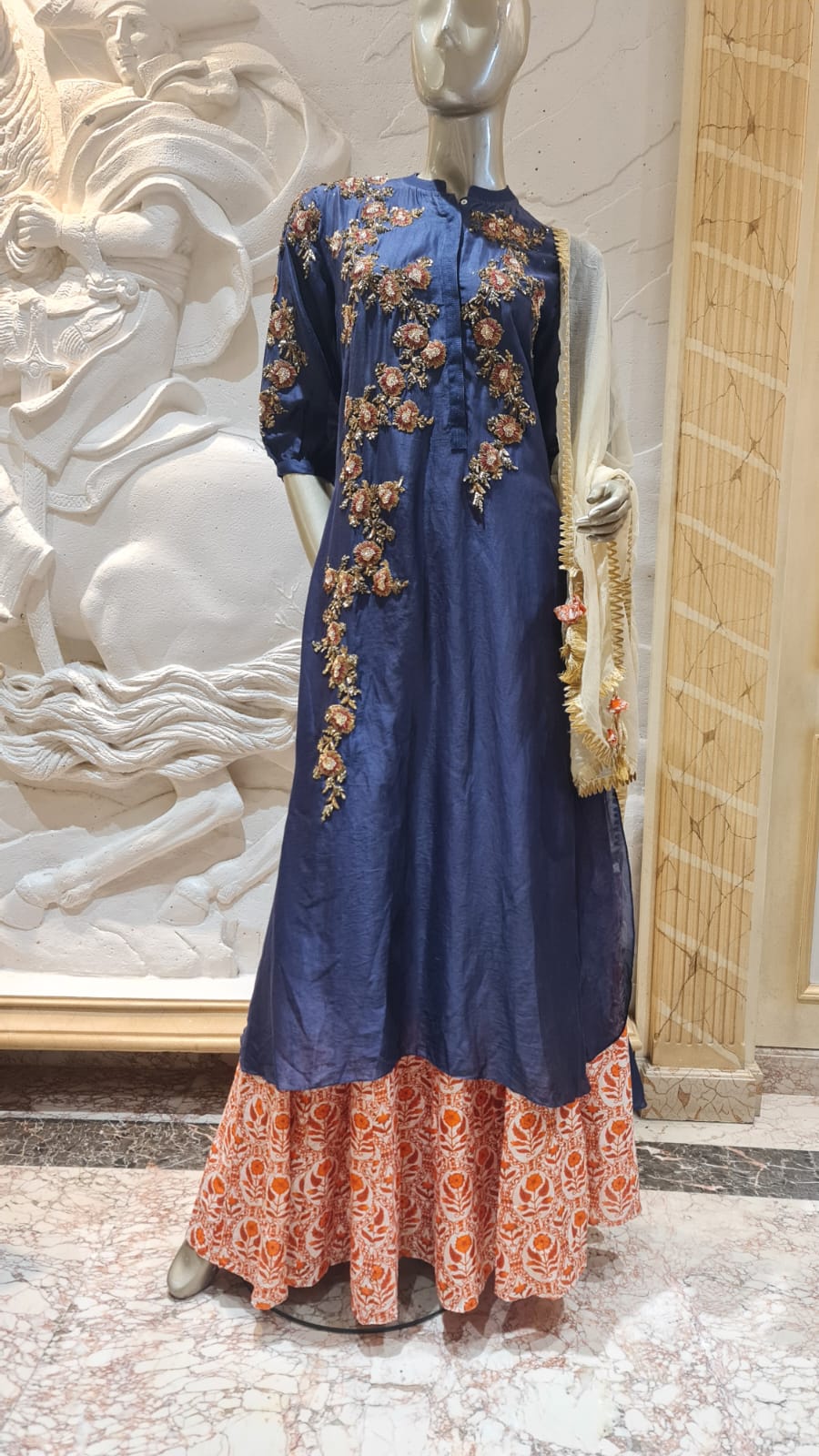 This beautiful kurta set features a navy blue kurta with intricate floral embroidery and a contrasting orange skirt with a printed pattern. A delicate dupatta completes the elegant ensemble.