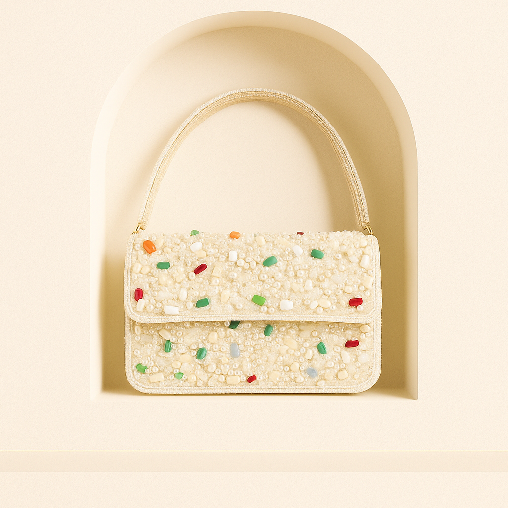A chic statement clutch adorned with pearls and colorful beads, adding a playful yet elegant touch to your look. Perfect for festive evenings and modern ethnic outfits.