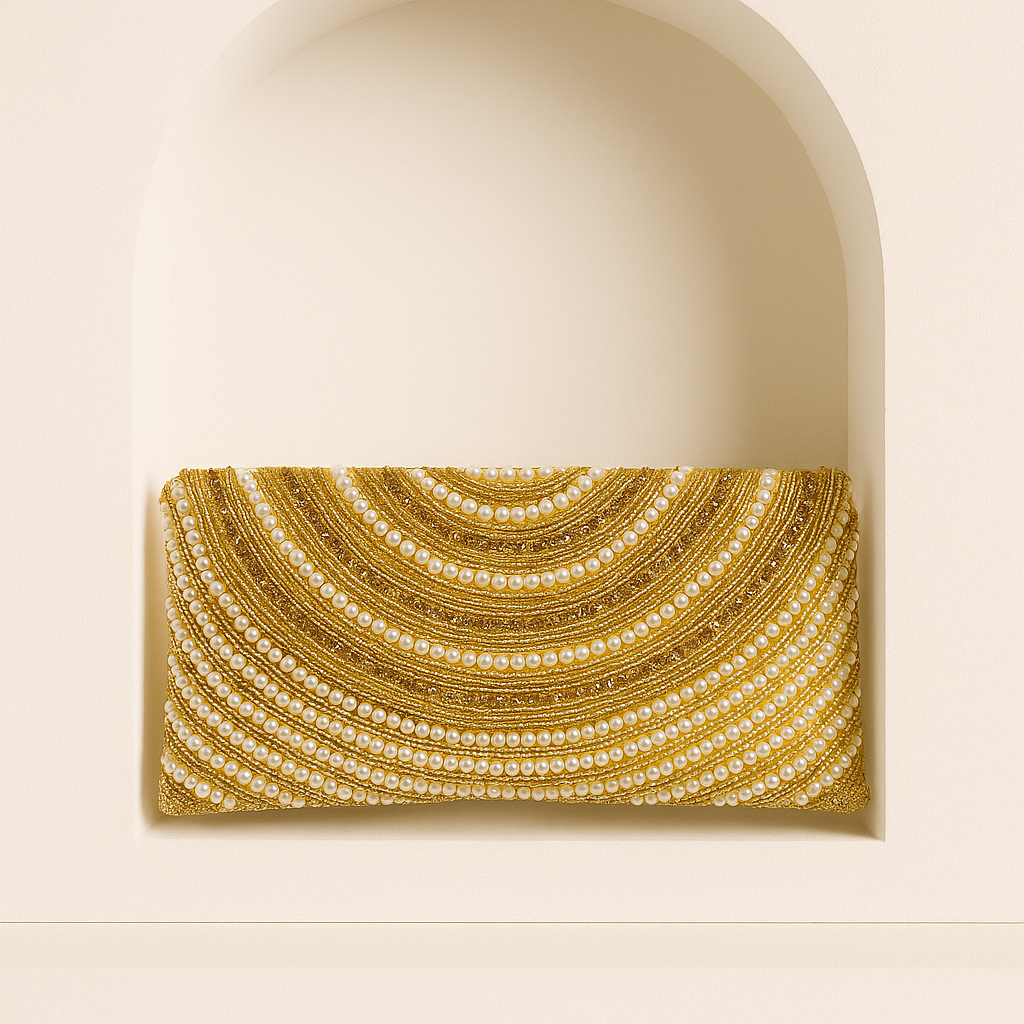 This stunning pearl-embellished clutch adds a touch of timeless elegance to any look. Perfect for festive occasions or evening soirées, it’s your go-to statement piece.
