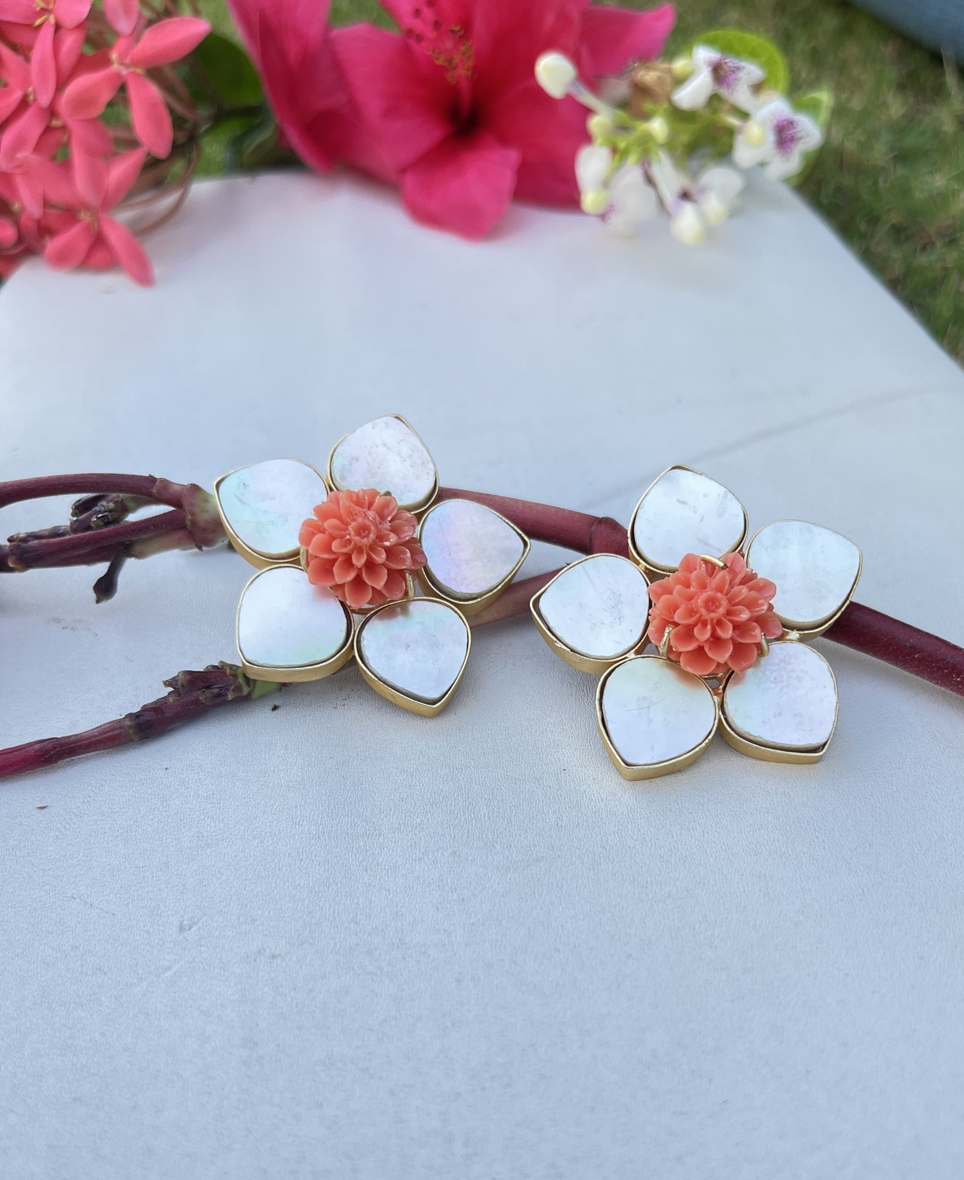 These charming earrings feature delicate, iridescent petals encircling a textured coral-colored center, all set in a subtle gold tone. They bring a touch of natural beauty to any ensemble.