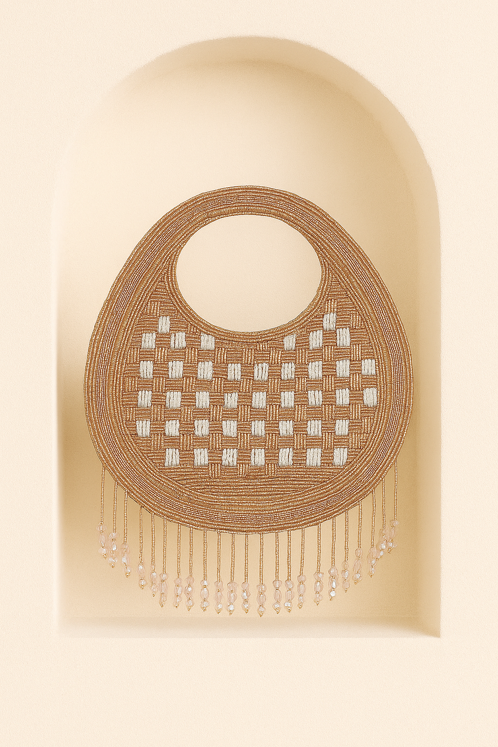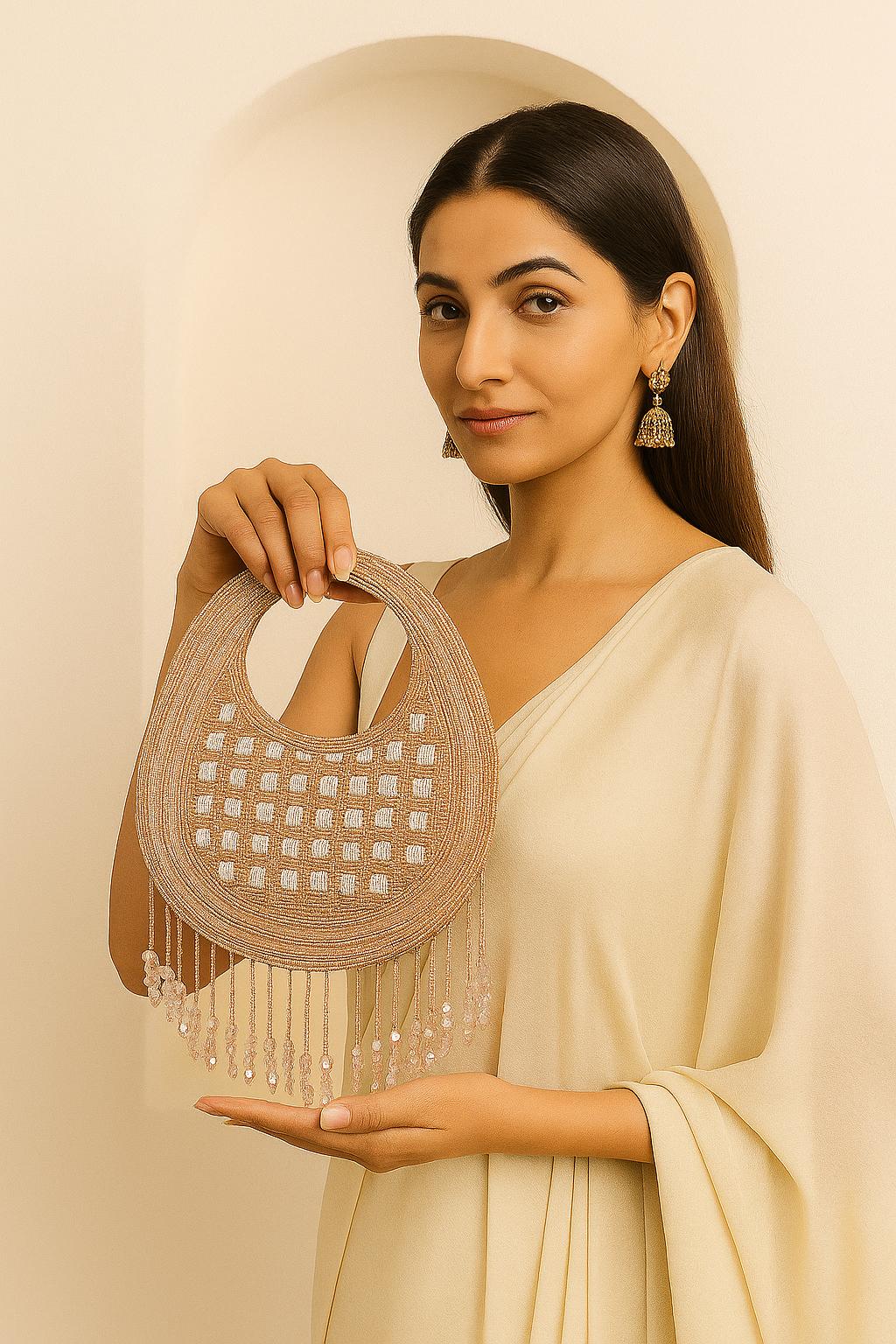 A handcrafted clutch adorned with glimmering beads and pearl-like accents. Elegant and modern, perfect for adding a touch of luxe to any outfit.