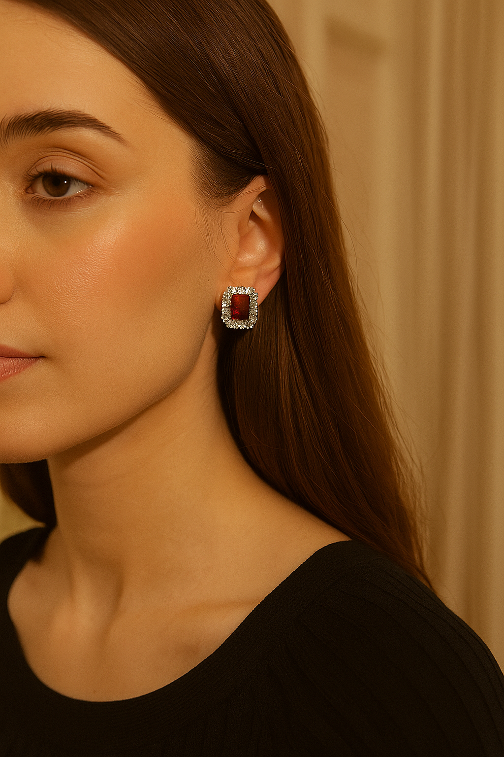 Glamorous ruby red studs framed with sparkling crystal stones for a timeless statement. Perfect to elevate your western or evening looks with royal charm.
