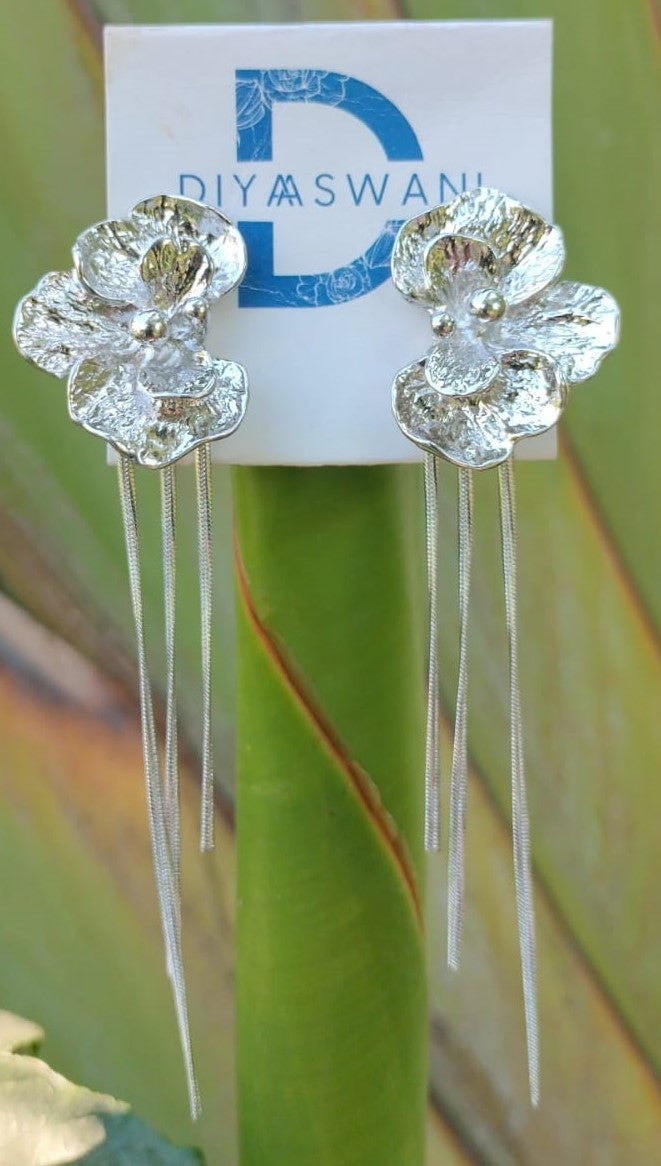 These silver earrings feature a delicate floral design with a cascading chain tassel. Perfect for adding a touch of elegance to any outfit.