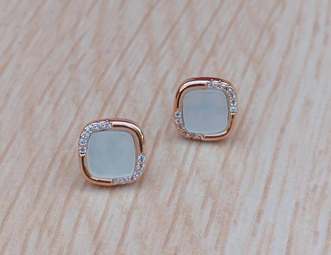 These elegant studs feature a lustrous square stone adorned with a sparkling cluster of cubic zirconia, adding a touch of glamour to any look.