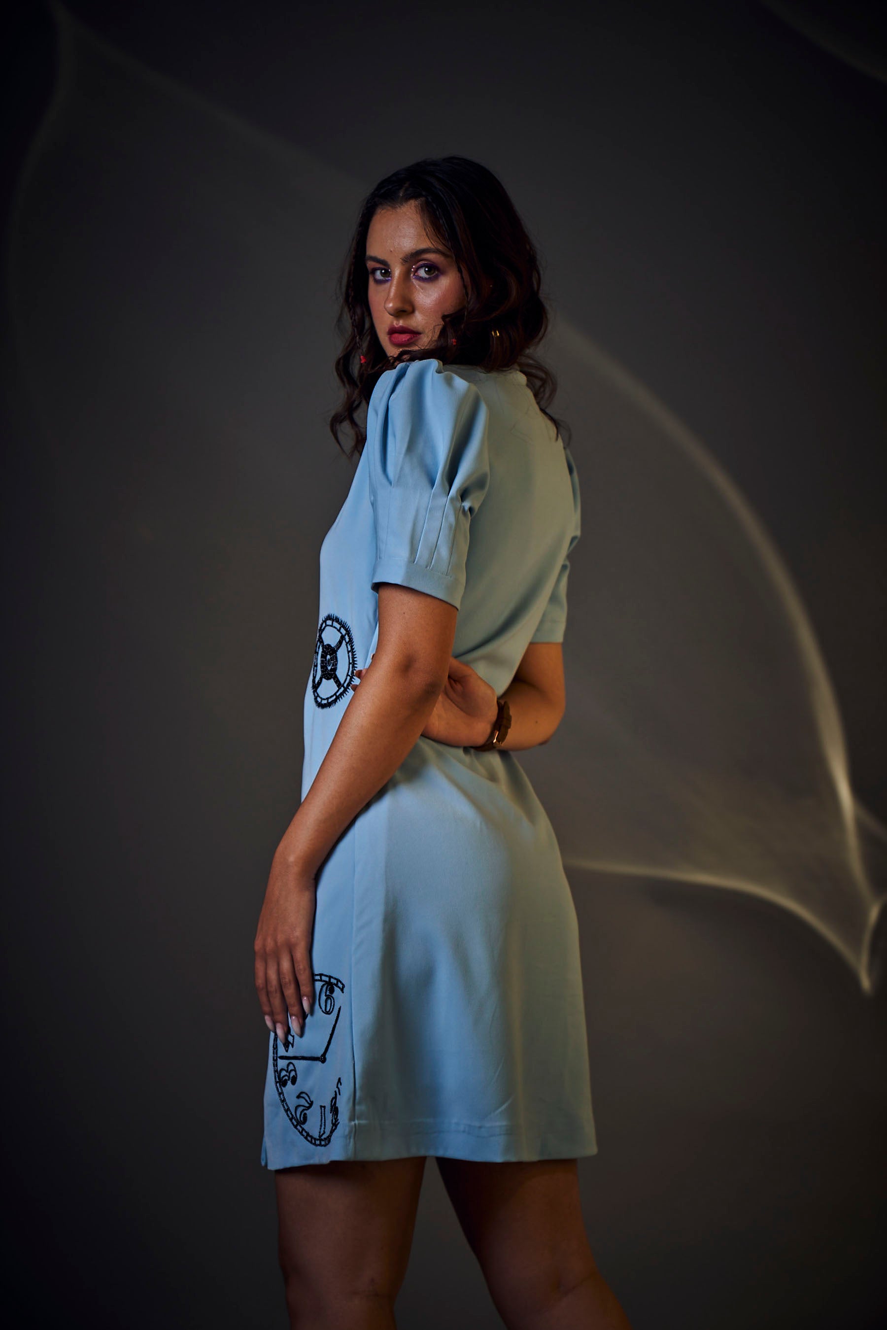 Our powder blue shirt dress is enhanced with tucked puff sleeves and embellished with time machine concept. One doesn't needs any occasion to wear this ,it can be worn for brunch, hi teas, sundowner and even in formal gatherings.